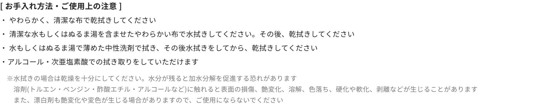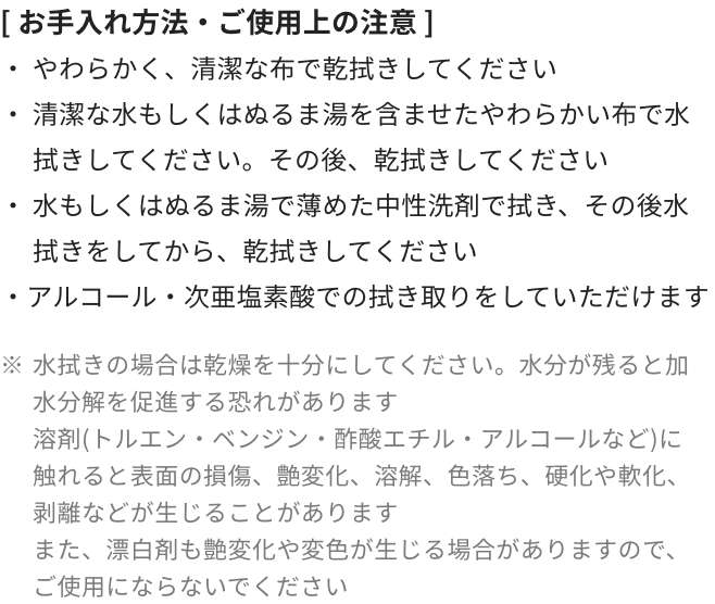 また変色や塗装に影響が出る可能性がありますので、ベンジン、アルコール、シンナーなど揮発性のものは使用を避けてください。