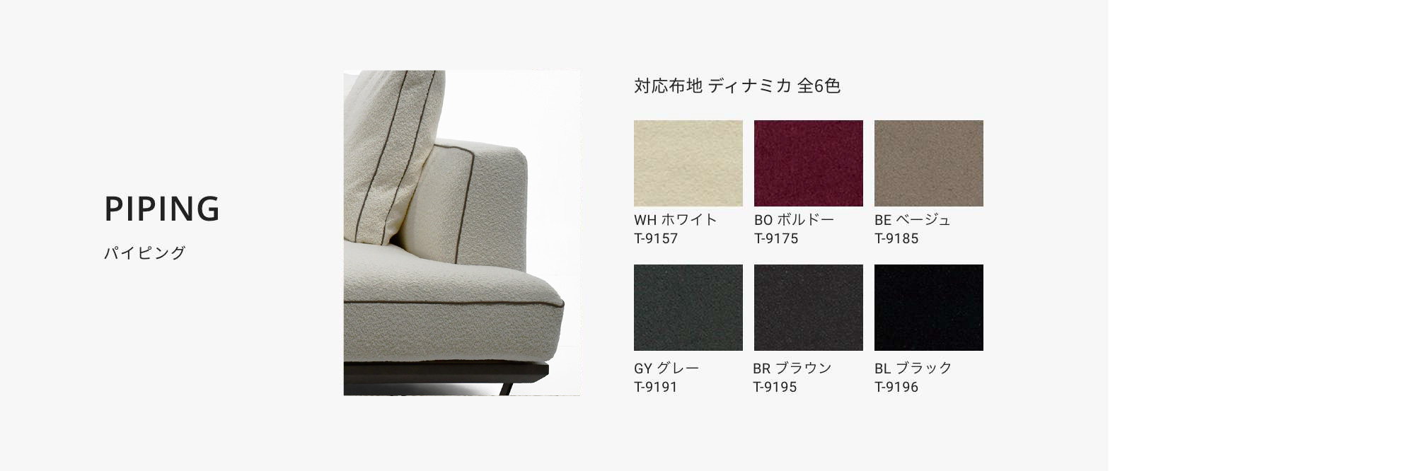 耐久性・安定感に優れた座り心地のハードタイプ(H)の2種類からお選びいただけます - 通常仕様(つまみ縫い)、パイピング仕様がお選びいただけます(ボルスターは通常仕様のみ)
