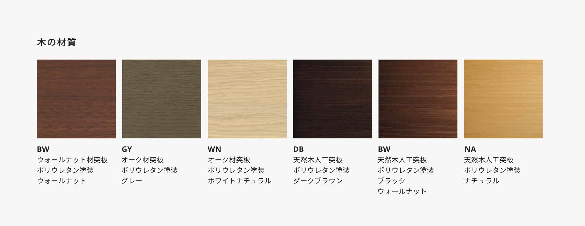 木部: ウォールナット材突板 ポリウレタン塗装(W)/ウォールナット(BW) オーク材突板 ポリウレタン塗装(O)/グレー(GY)・ホワイトナチュラル(WN) 天然木人工突板 ポリウレタン塗装(M)/ダークブラウン(DB)・ブラックウォールナット(BW)・ナチュラル(NA) - 受注生産品(納期8週間)