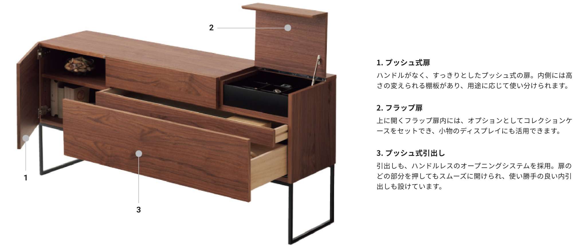 天板面、フラップ扉、引き出しなど、